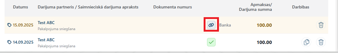 - Sasaistot darījumu ar atbilstošu bankas transakciju sadaļā "Bankas", ja sadaļā "Bankas" ir pievienots bankas konts (PRO un PREMIUM abonementiem).