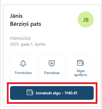 Kad ir ievadīta visa informācija darbinieka kartiņā, tostarp ievadītas darba stundas kalendārā, ja ir izvēlēta stundas likme, prombūtne, atvaļinājums, piemaksas par konkrētu mēnesi, tad pie darbinieka kartiņas ir jāspiež "Izmaksāt algu", tad tiks atvērta jauna izdevuma kartiņa zem darījuma apraksta "Algotu darbinieku darba algas un saistītie nodokļu maksājumi (VSAOI un IIN)"