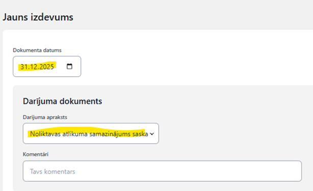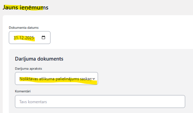 Bet var būt rēķini, kas izrakstīti jau 2026.gada janvārī, bet attiecas uz 2025.gadu – tad izdevumu darījumā jānorāda arī pakalpojuma saņemšanas datums. Dokumenta datums ir rēķina datums, pakalpojuma saņemšanas datums – tā mēneša pēdējais datums, uz kuru attiecas konkrētais izdevums.